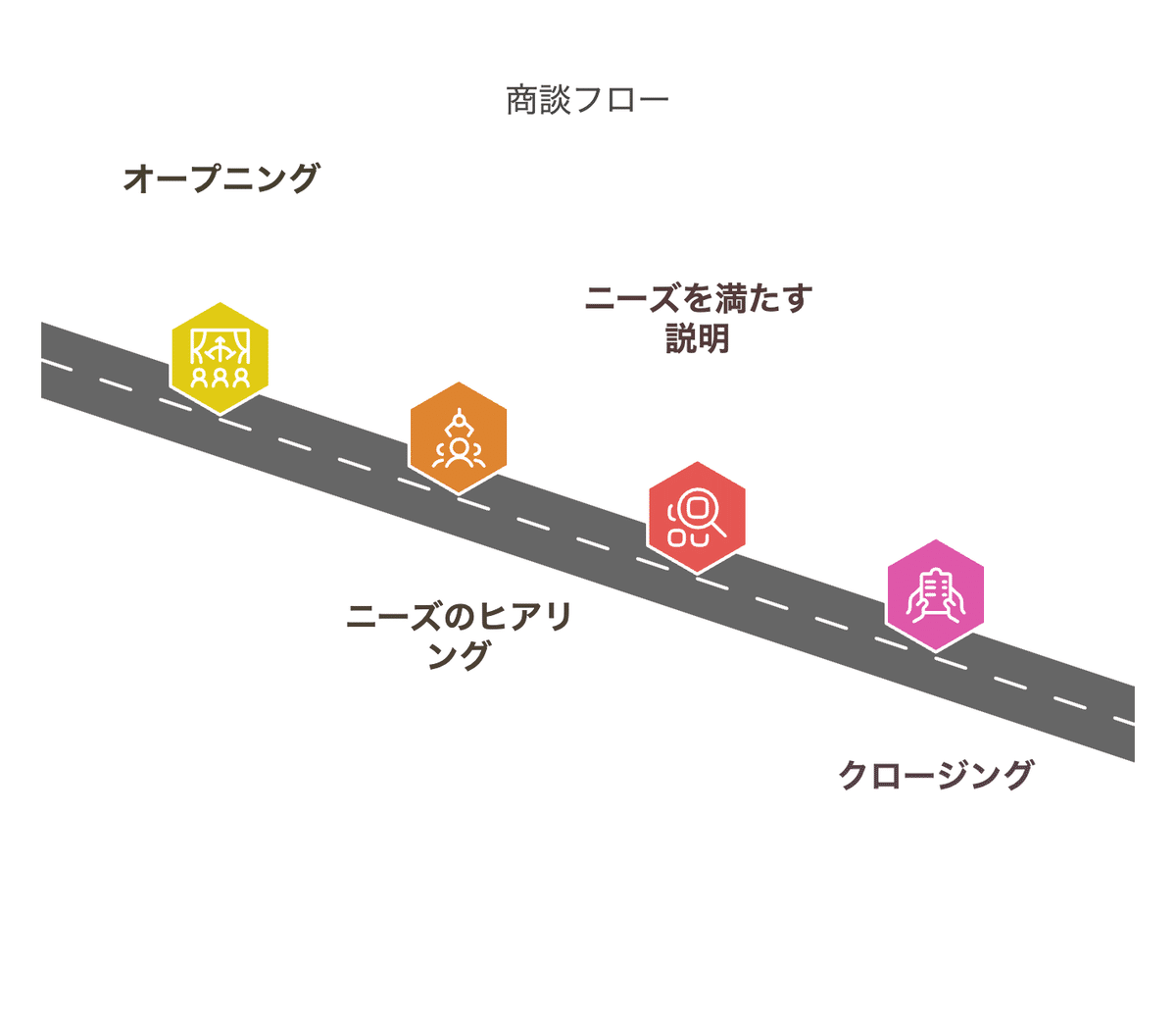 「2.」でお客様にニーズのヒアリングができた後は、そのニーズをどう自社のサービスで満たすことができるかの説明を行い、価値を感じてもらえるようにいたします。
