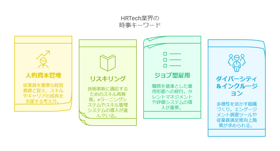 HRTech業界では、「人的資本経営」「リスキリング」「ジョブ型雇用」「ダイバーシティ&インクルージョン」などのトレンドワードが注目されています。これらのキーワードは、エンタープライズ企業の経営層や人事担当者が関心を寄せているテーマであり、適切に活用することで相手の関心を引くことができます。
