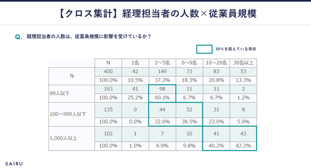 経理担当者の人数は、従業員規模99人以下の企業では2~5名(60.1%)が最も多く、次いで1名(25.2%)。従業員規模100~999人以下では、6~9名(38.5%)が最も多く、次いで2~5名(32.6%)。従業員規模1,000人以上では、30名以上(42.2%)が最も多く、次いで10~29名(40.2%)となっています。