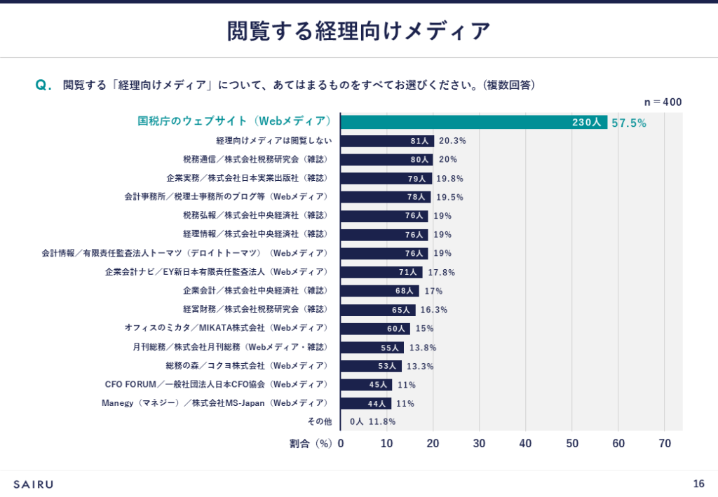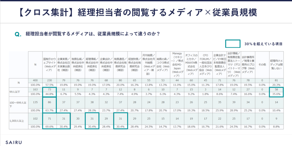 一方、100~999人以下、1,000人以上では、メディアの閲覧傾向が高いです。「国税庁のウェブサイト(Webメディア)」はもちろんのこと、とくに雑誌系メディアの閲覧傾向が高いことがうかがえます。経理担当者へのインタビューによると、雑誌系メディアの定期購読を企業単位で行っているケースも多く、そこで情報収集をすることが多いと想定されます。