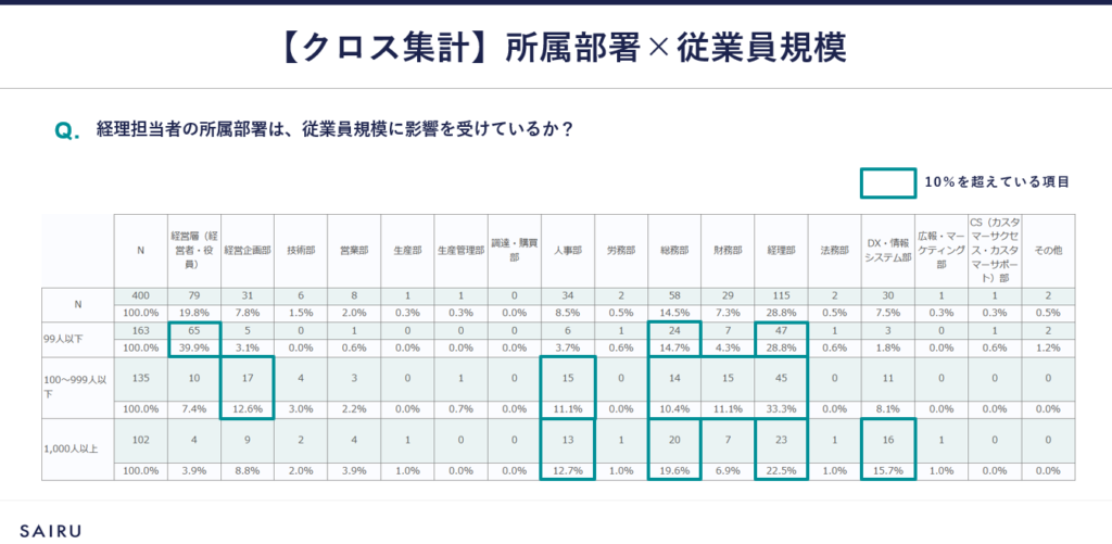 一方、従業員100人以上の企業になると、組織構造がより専門化し、経理部に所属する担当者が経理業務を行うケースが最も多くなります。しかし注目すべきは、これらの企業でも経営企画部や人事部など、他部署に所属しながら経理業務を担当している人材が一定数存在することです。これは、経理機能が複数の部署に分散していたり、部門横断的な業務設計がなされていたりすることを示唆しています。