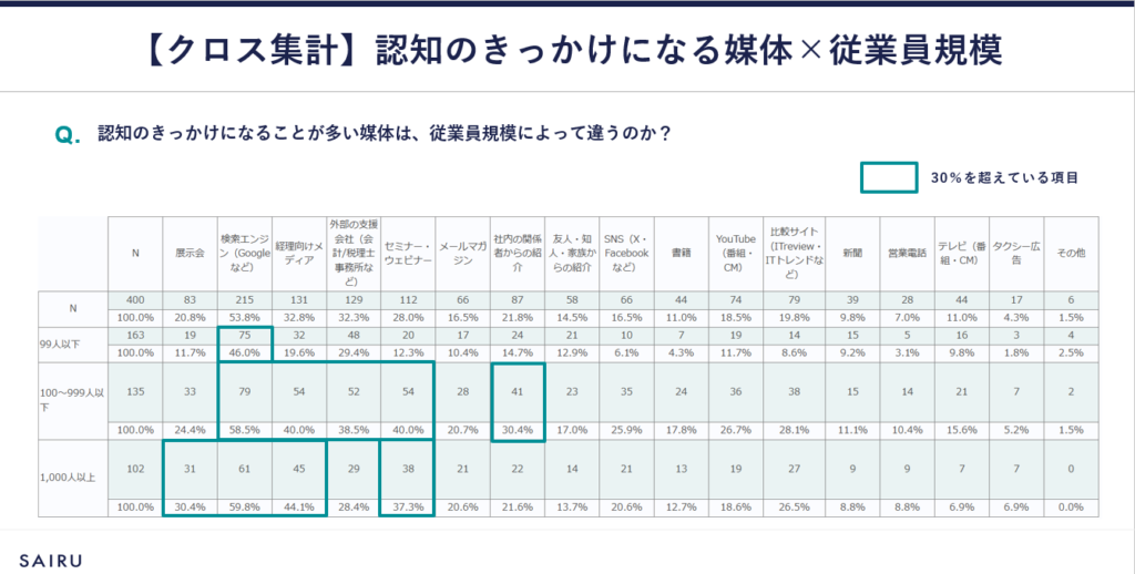 従業員規模によってタッチポイントや課題が異なるため、訴求するメディアや内容を分けることで、よりターゲットに合ったコミュニケーションがはかれます。とくに従業員規模99人以下の企業と100人以上の企業では、情報収集行動に明確な差があることが本調査で明らかになりました。