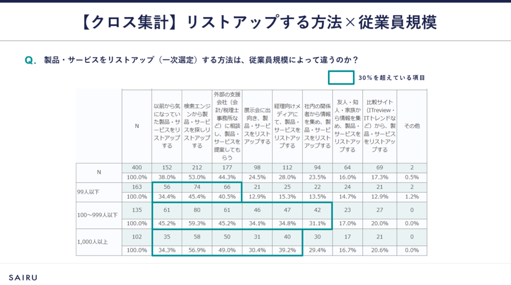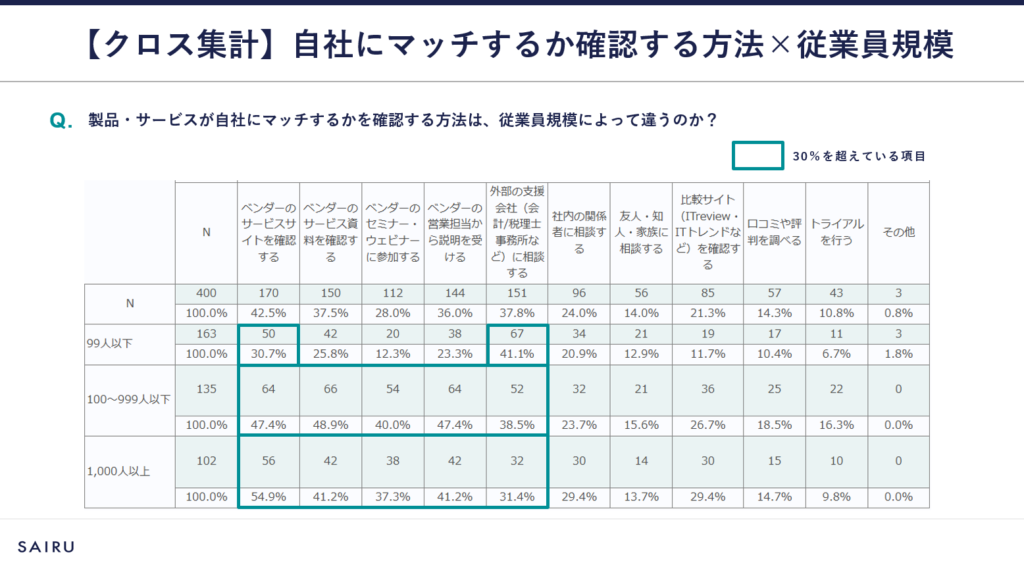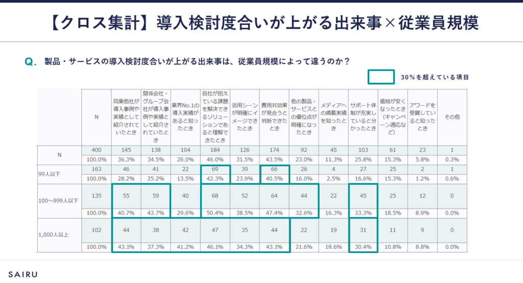 さらに、従業員規模によって傾向が異なる設問も見られました。自社のターゲットとなる企業の規模によって、異なるアプローチが求められることを認識しておきましょう。