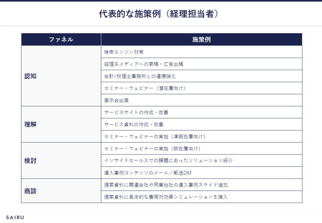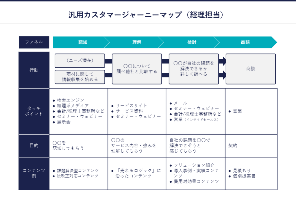 以下は、本調査結果をもとにした経理担当向けカスタマージャーニーマップと代表的な施策例です。自社の商材やリソースにあわせてカスタマイズしてください。