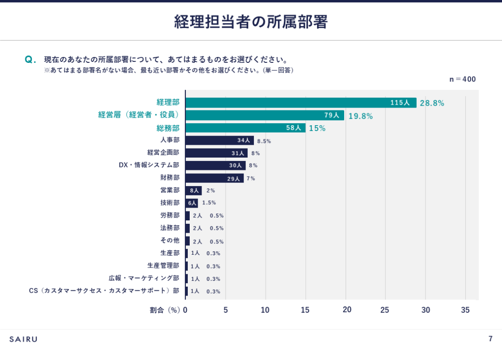 経理担当者の所属部門は、経理部(28.8%)が最も多く、次いで経営層(19.8%)、総務部(15%)という結果になりました。