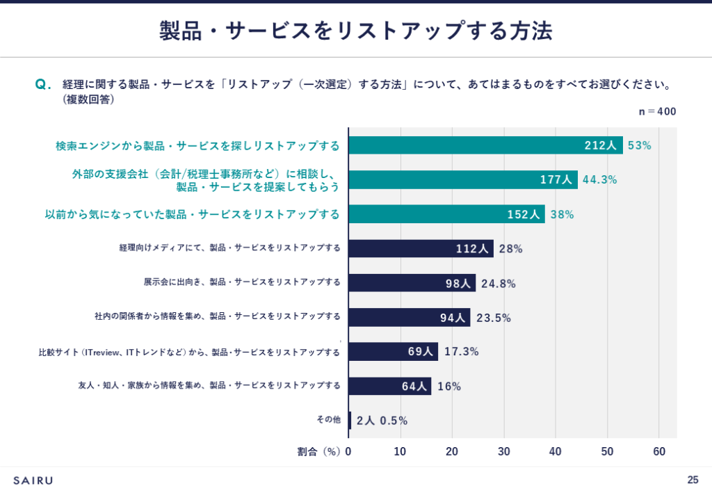 経理に関する製品・サービスをリストアップ(一次選定)する方法は、「検索エンジンから製品・サービスを探しリストアップする」(53%)が最も多く、次いで「外部の支援会社(会計/税理士事務所など)に相談し、製品・サービスを提案してもらう」(44.3%)、「以前から気になっていた製品・サービスをリストアップする」(38%)と続きます。