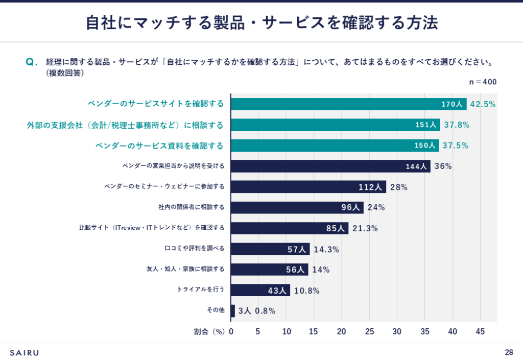経理に関する製品・サービスが自社にマッチするかを確認する方法は、「ベンダーのサービスサイトを確認する」(42.5%)が最も多く、次点で「外部の支援会社(会計/税理士事務所など)に相談する」(37.8%)、「ベンダーのサービス資料を確認する」(37.5%)と続きます。