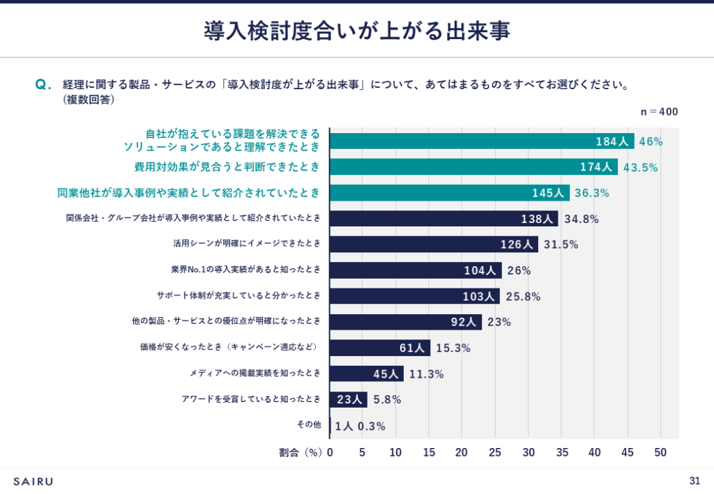 経理に関する製品・サービスの導入検討度合いが上がる出来事は、「自社が抱えている課題を解決できるソリューションであると理解できたとき」(46%)が最も多く、次点で「費用対効果が見合うと判断できたとき」(43.5%)、「同業他社が導入事例や実績として紹介されていたとき」(36.3%)と続きます。