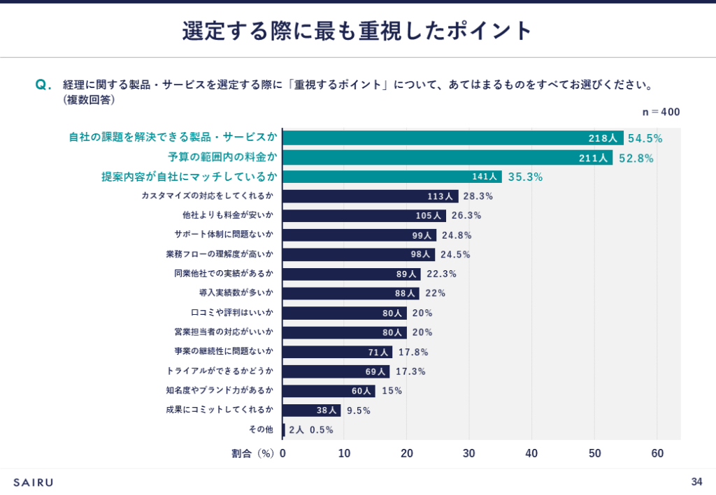 経理に関する製品・サービスを選定する際に重視したポイントは、「自社の課題を解決できる製品・サービスか」(54.5%)が最も多く、次点で「予算の範囲内の料金か」(52.8%)、「提案内容が自社にマッチしているか」(35.3%)と続きます。