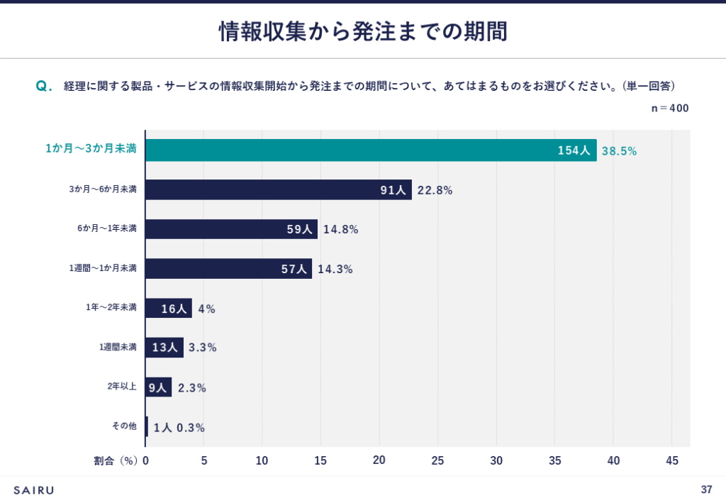 - 情報収集開始から発注までの期間は「1か月~3か月未満」が最多で、6割以上が3か月以内に意思決定している