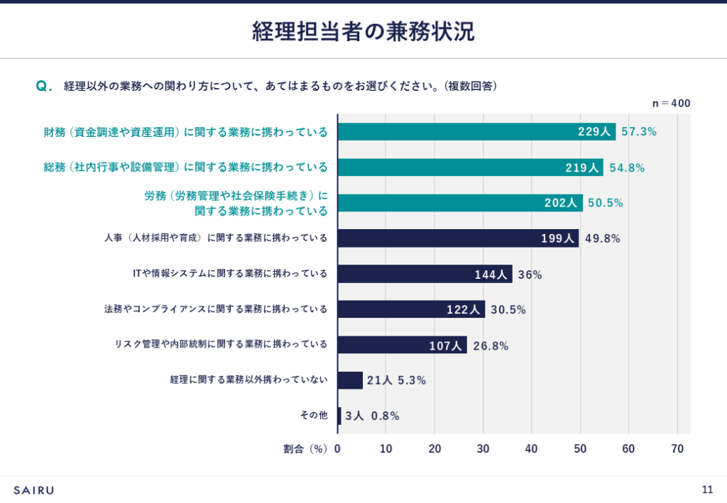 次の設問からは、94.7%の経理担当者が経理業務以外と兼務している実態が明らかになりました。兼務している業務は、財務>総務>労務>人事の順に多くなっています。