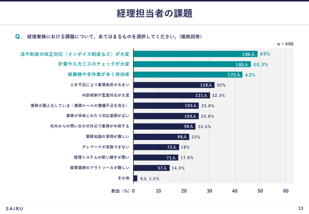 経理担当者の課題を複数回答で聞いたところ、「法や制度の改正対応(インボイス制度など)が大変」(49%)が最も多く、次いで「計算や入力ミスのチェックが大変」(46.3%)、「紙業務や手作業が多く非効率」(43%)となりました。