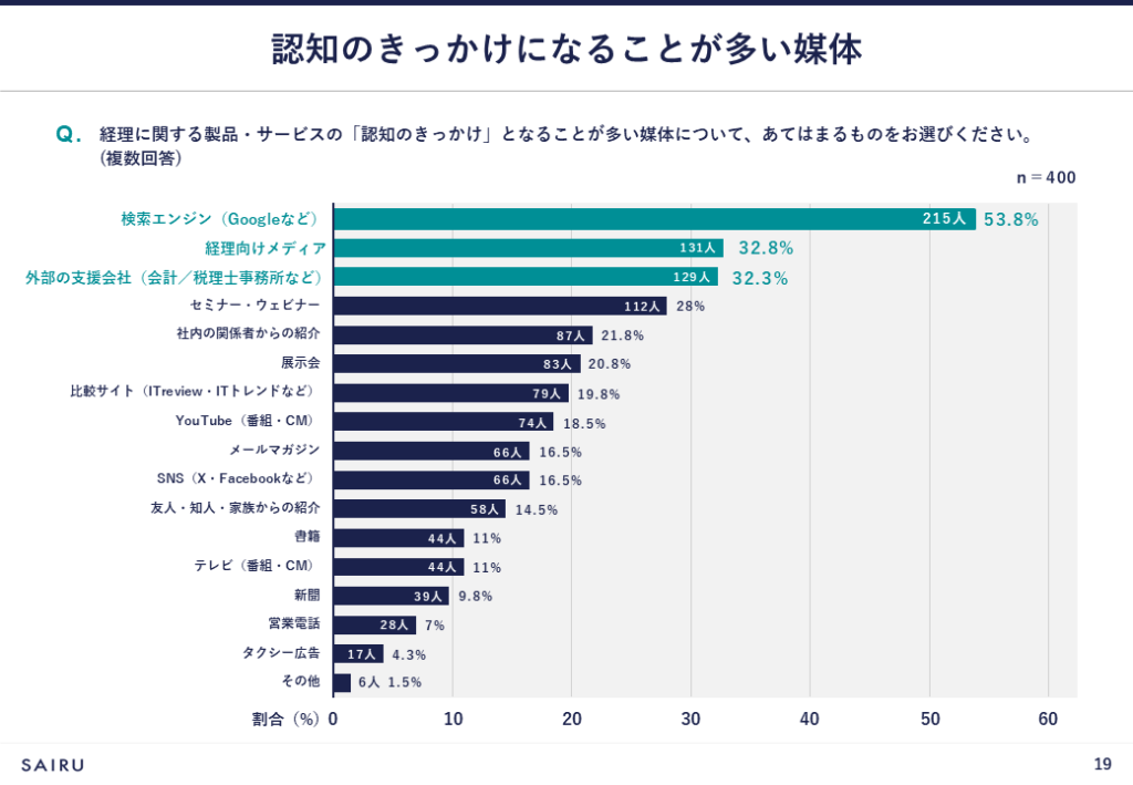 - 製品・サービスを認知するきっかけとなった媒体は、「検索エンジン(Googleなど)」が最も多く、次点で「経理向けメディア」と「外部の支援会社(会計/税理士事務所など)」