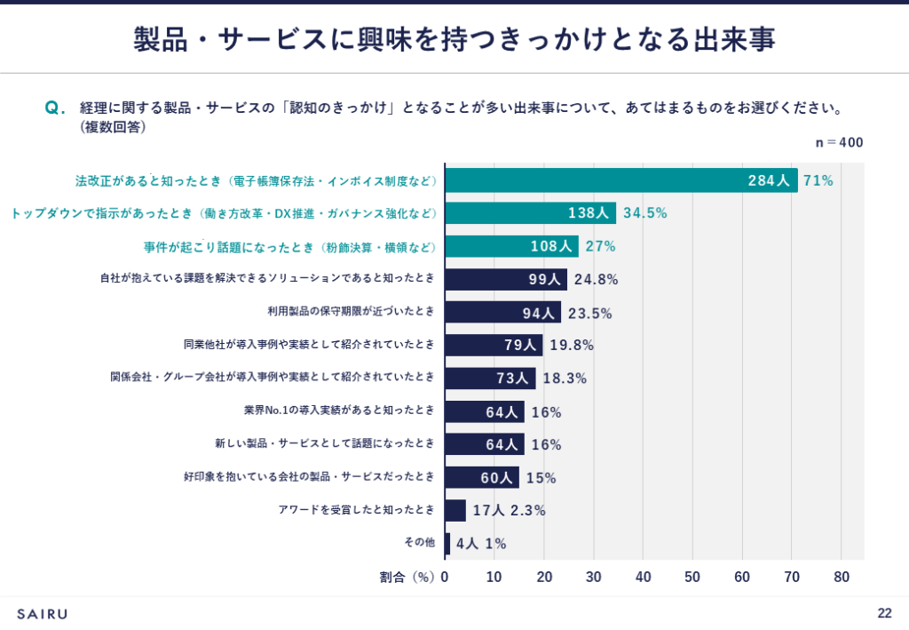 - 製品・サービスに興味を持つきっかけは、「法改正があると知ったとき(電子帳簿保存法・インボイス制度など)」が突出して多く、次いで「トップダウンで指示があったとき(働き方改革・DX推進・ガバナンス強化など)」と続く