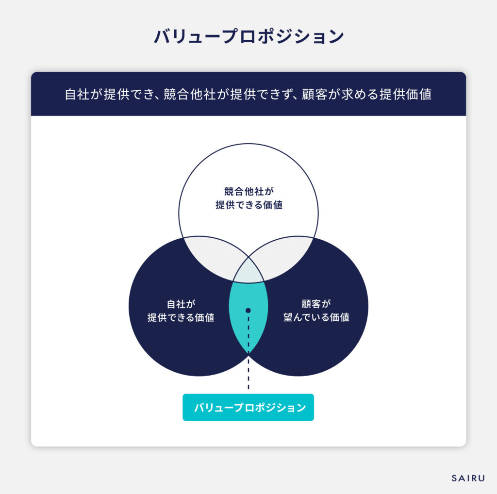 バリュープロポジションとは、自社の製品やサービスが顧客に提供できる価値を洗い出し、整理するためのものです。才流では、「自社が提供できて、競合他社が提供できない、顧客が求める独自の価値を表したもの」と定義しています。