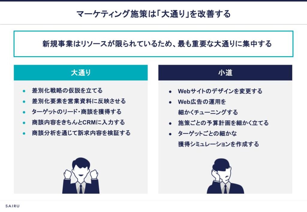 また、マーケティング施策に関しては細かな改善に終始していては十分な成果は得られません。リソースが限られている新規事業では、もっとも効果が期待できる「大通り」に集中して改善しましょう。