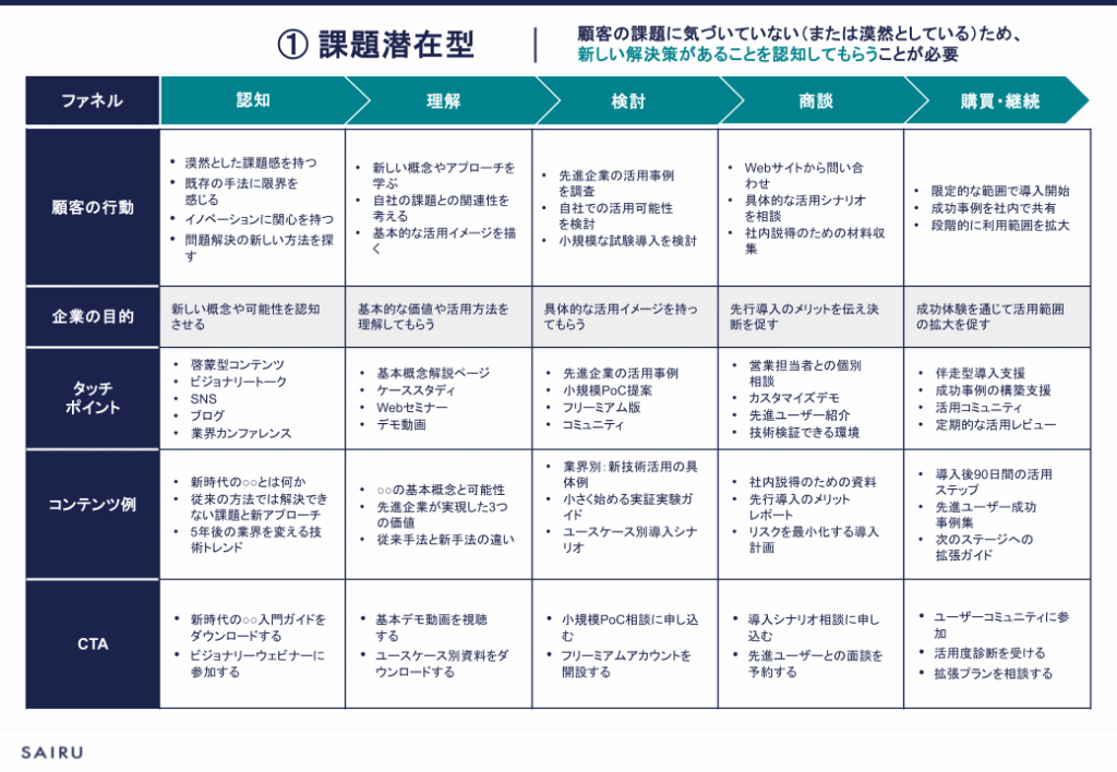 課題潜在型の顧客には、課題を明確にすること、そして商品・サービスのユースケースを知ってもらいイメージを持ってもらうことが重要です。開発・カスタマーサクセス・マーケティング部門が連携し、ユーザーの導入事例を発信したり、業界のオピニオンリーダーや先進企業を巻き込んで成功事例を作ったりするのが有効です。