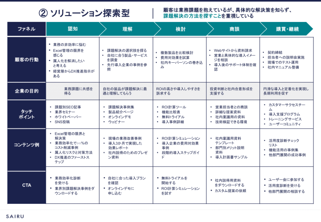 ソリューション探索型の顧客には、課題を具体的に言語化して共感を得たり、気づきを促すことで、製品・サービスの検討段階を進めてもらう必要があります。