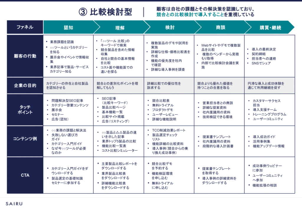 | ③比較検討型 | 高い | あり | ・商談で「競合と比べてどう違うか」を聞かれることが多い ・「比較」「レビュー」といったキーワードで検索し、コンバージョン することが多い |
