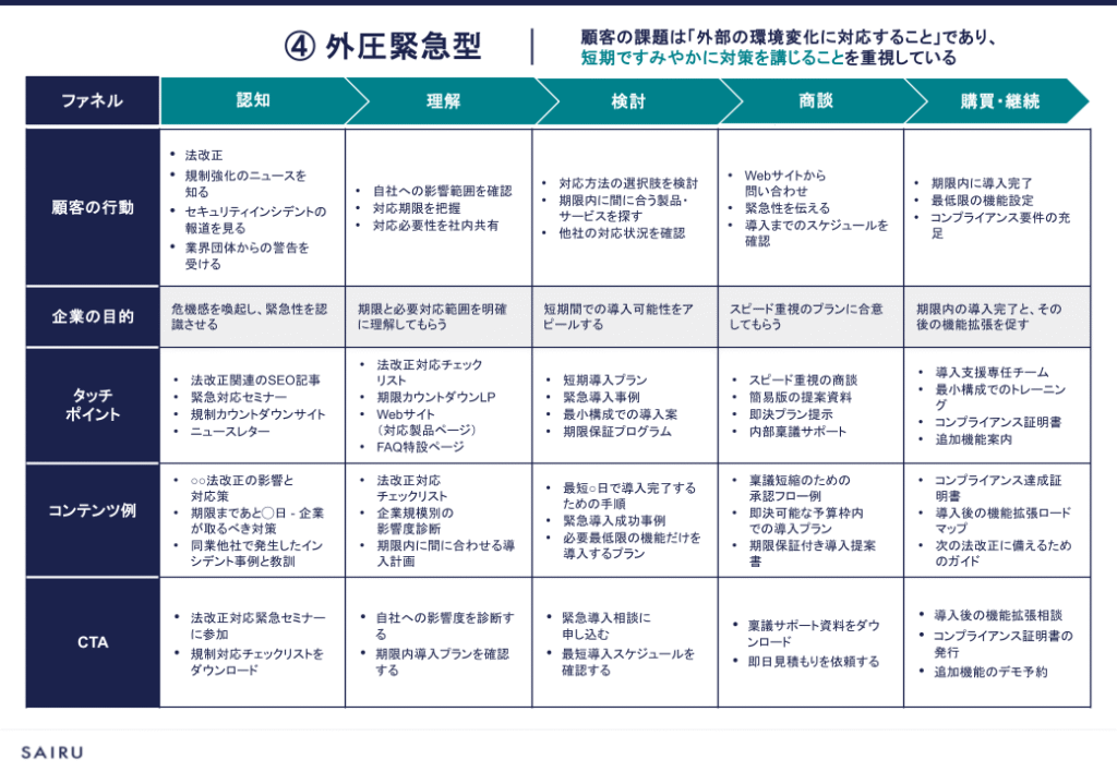 法改正や業界規制の変更など、外的要因によって緊急性の高いニーズが生じている状態の顧客を「外圧緊急型」と分類しました。