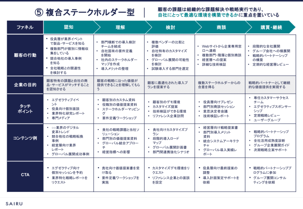 | ⑤複合ステークホルダー型 | 高い | あり | ・商談から受注までに複数の部門や階層の人がかかわる ・子会社や関連会社への展開、グローバル展開を検討している大企業 ・1件あたりの平均契約額が大きい |