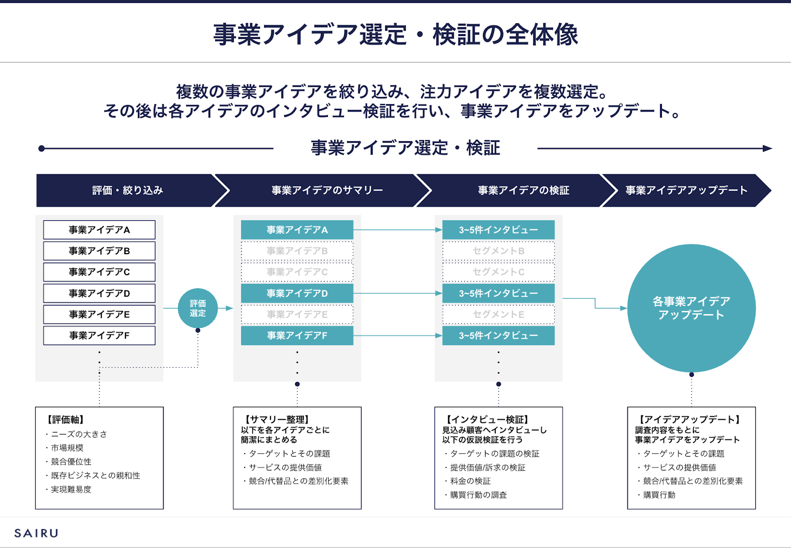 本記事の解説にあたり、前提として新規事業アイデア選定の全体像を整理します。フェーズは4つに分けられます。