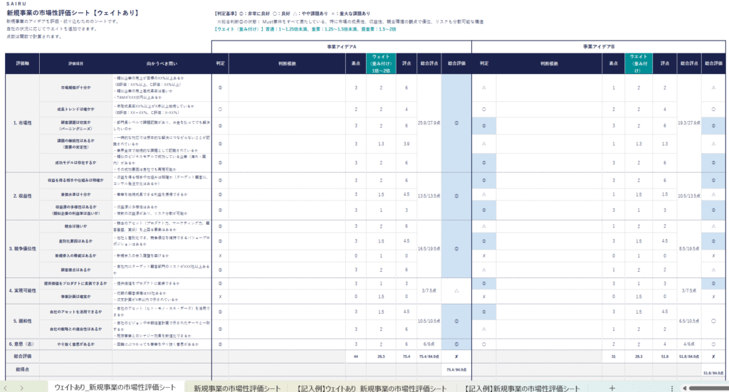 ここは、時間をかけて厳密に行うというより、方向性が間違っていなければOKとしましょう。テンプレートでは、各項目に対し、2倍までの数字を入れて判定に重み付けができるようになっています。