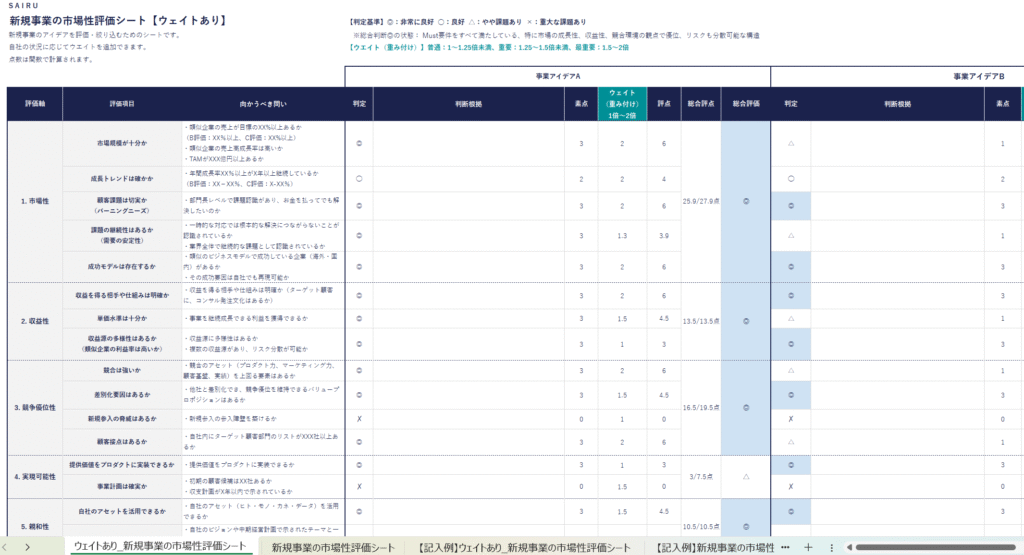 最終的には会社が新規事業に何を求めているかによります。短期的な収益貢献が目的なら「収益性」を、将来の成長エンジン創出が目的なら「市場性」を重視するなど、目的に応じて評価軸の優先順位を変えていくことをおすすめします。
